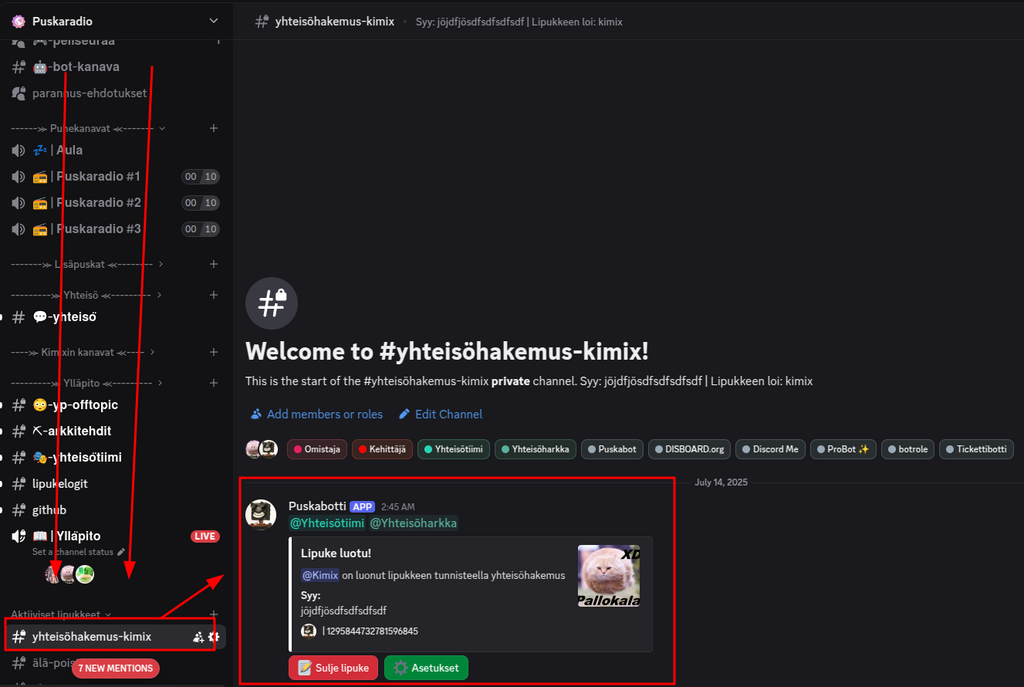 3.Vasemmalle alas ilmestyy nimelläsi yhteisöhakemus -kanava, johon hakemuksesi ilmestyy. Sillä kanavalla voit käydä keskustelua ylläpidon kanssa ja seurata hakemuksesi edistymistä. Hakemus hyväksytään lähes aina, mikäli sinulle ei ole merkittävää rangaistushistoriaa palvelimellamme.