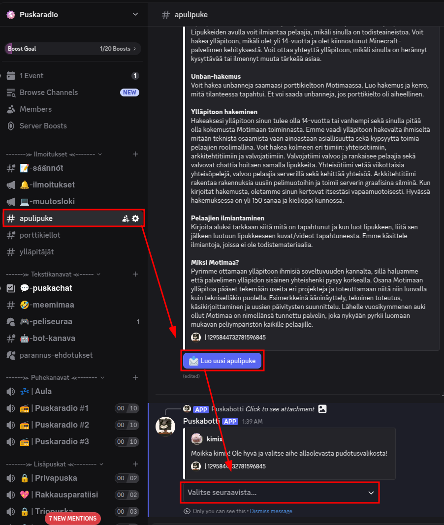 2. Avaa itsellesi apulipuke, avaamalla #apulipuke tekstikanava ja valitsemalla alle ilmestyvästä valinnasta yhteisöpelit
